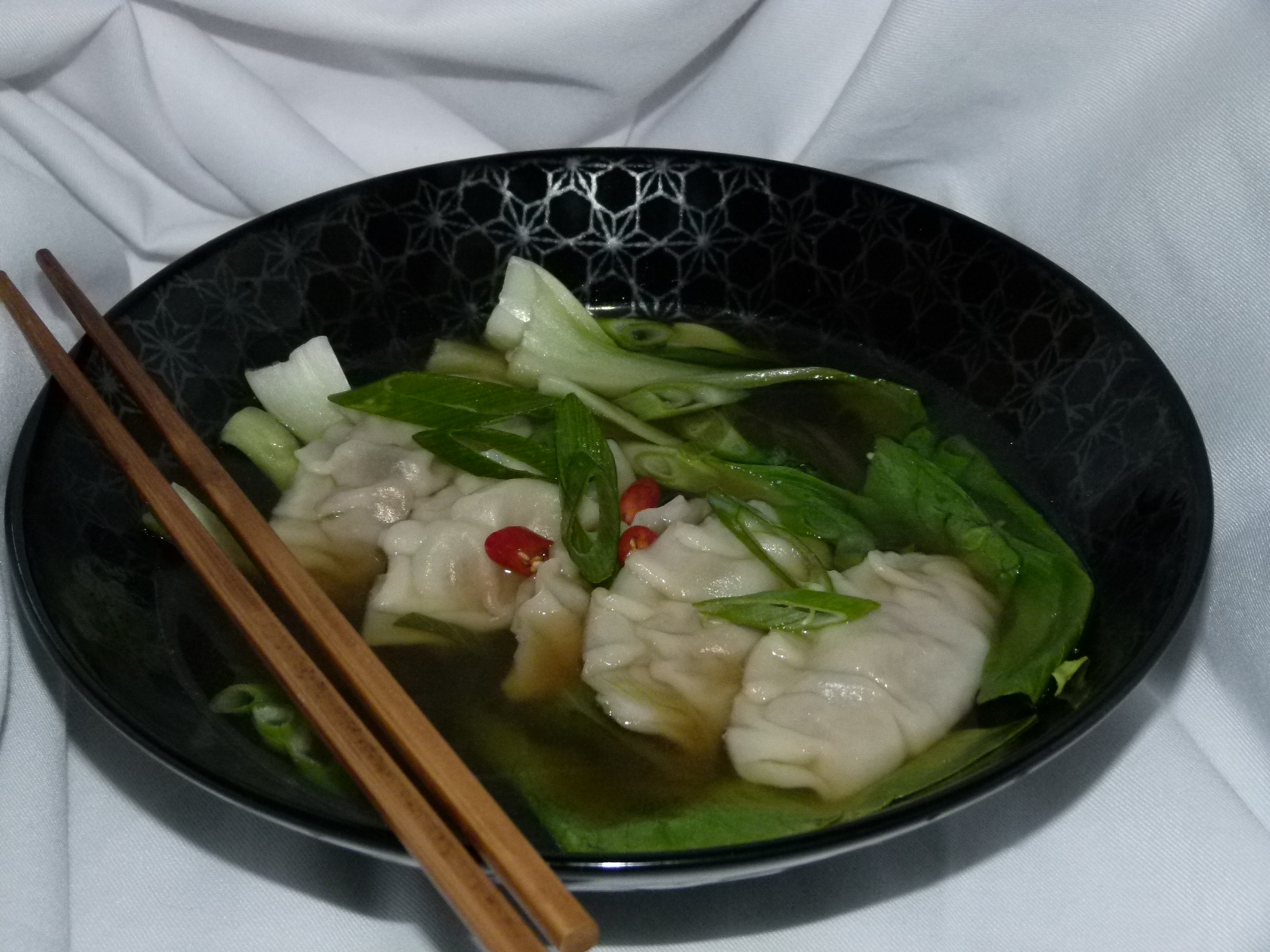 In a soup bowl place the bok choy with just enough mushroom broth to cover, add 5-6 wontons per bowl and garnish with spring onions and chilli. Serve immediately.