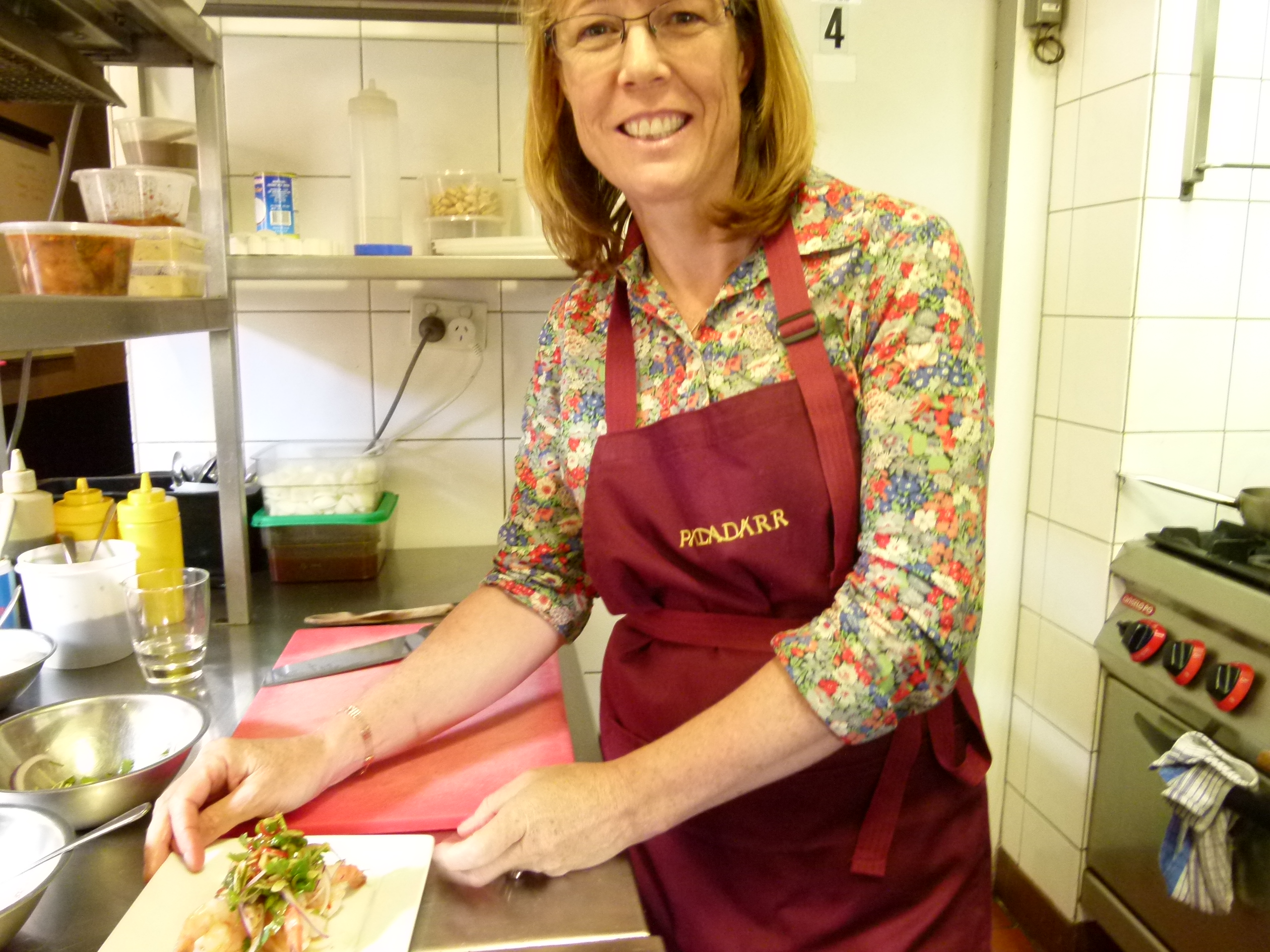 Paladarr restaurant in Alphington is where the class was held, with Chef Chaloem teaching 6 lucky people, which is intimate and friendly. All guests – myself, Lauri, Elizabeth, Michelle, Blado & Carmel – meet in the dining room before starting, getting to know one another over a refreshing drink. Bryan, the restaurant manager, hands us our aprons and we head into the kitchen. This is where the amazing fresh aromatics begin and continue throughout the next 3-4 hours.