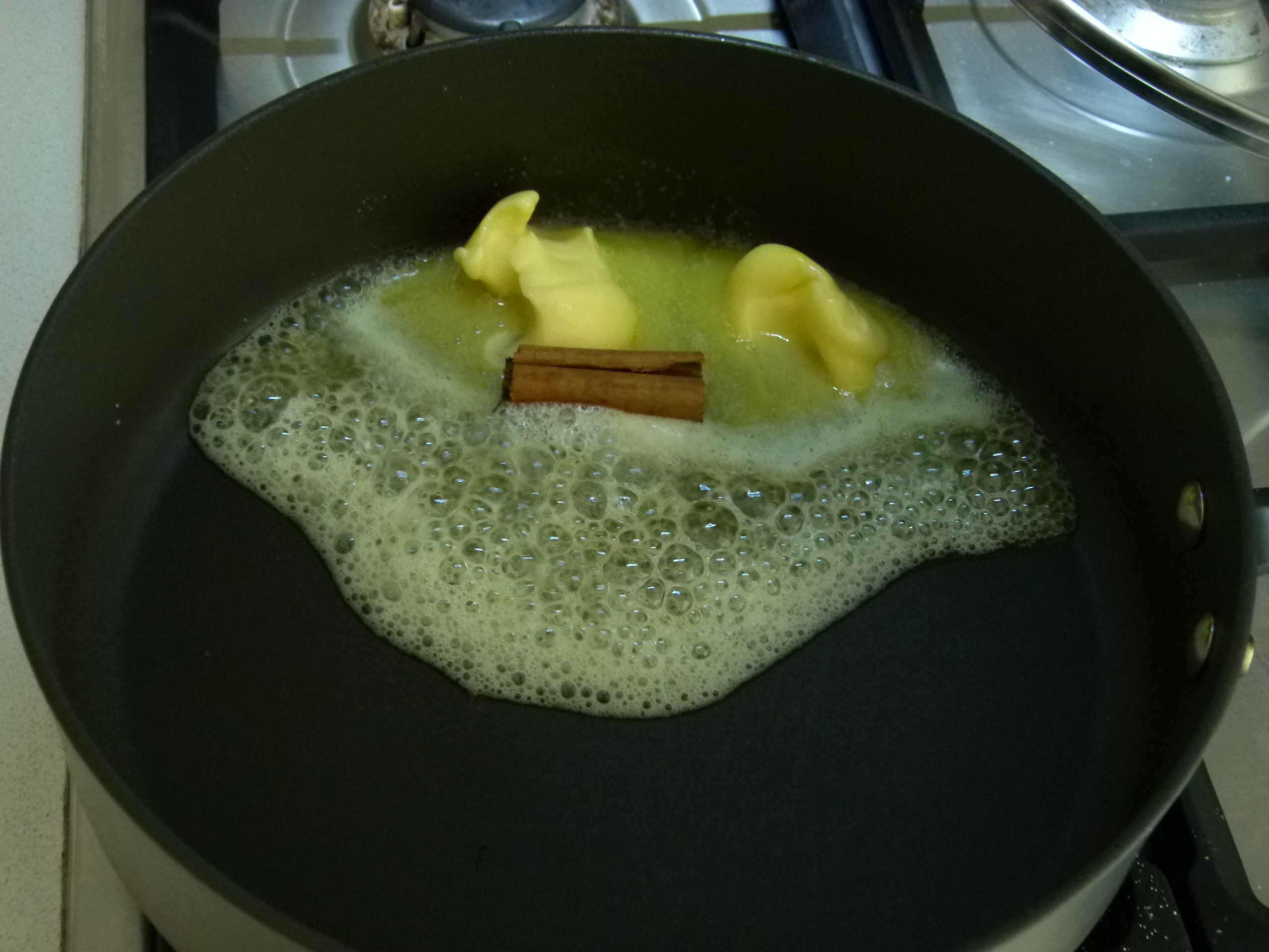 On a medium heat, add the butter to a frypan until melted. Add in the cinnamon stick until the butter is fragrant – 2-3 minutes. Keeping the cinnamon stick in the butter add the sliced onions and fry for 10 minutes, until they turn a golden/brown colour.