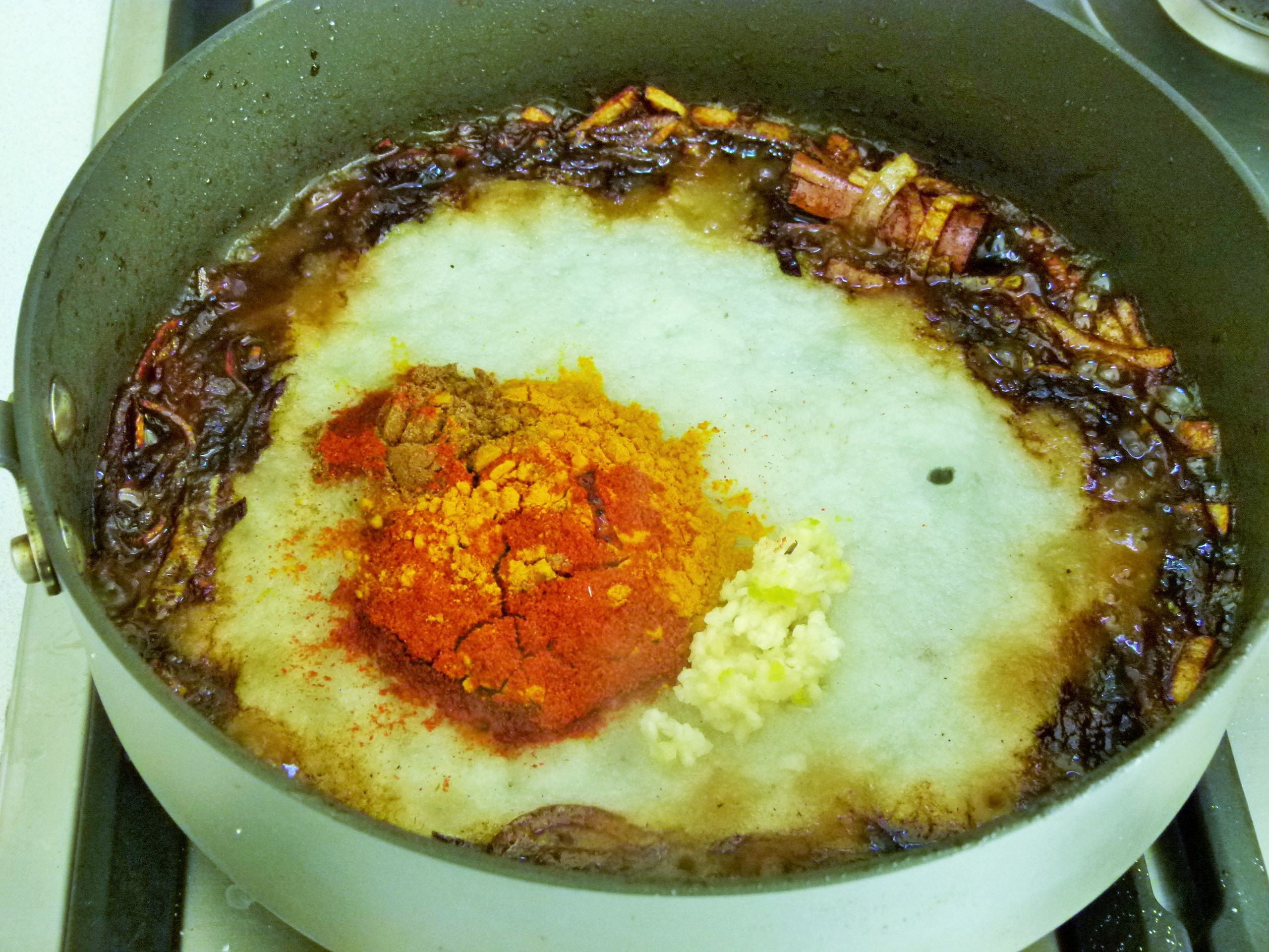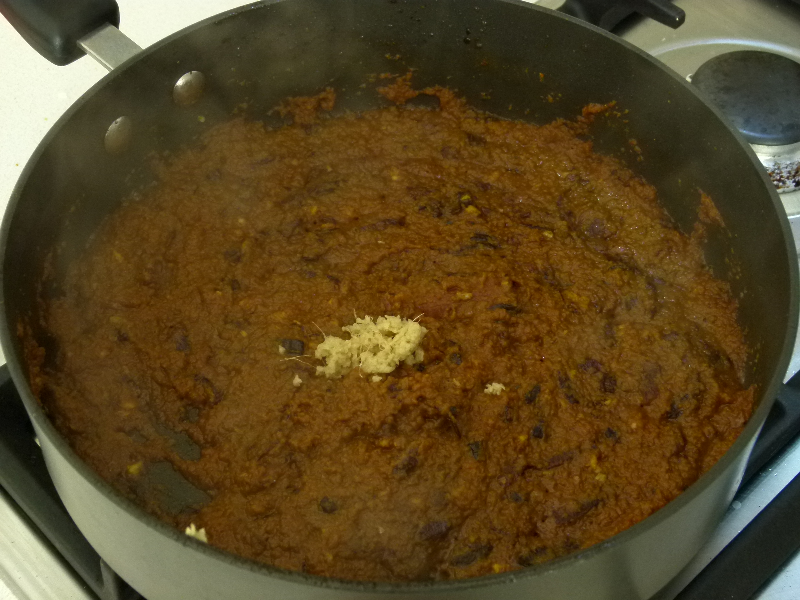 Turn the heat to low and stir in the onion paste, the Garam Masala, tumeric and Kashmiri chilli powders and garlic frying for 1-2 minutes, stirring continuously so it doesn’t stick to the bottom of the frypan. Add some water if needed throughout the next 5 minutes while cooking off the spices to release their flavours. Add the ginger and some more water to keep the paste from thickening.