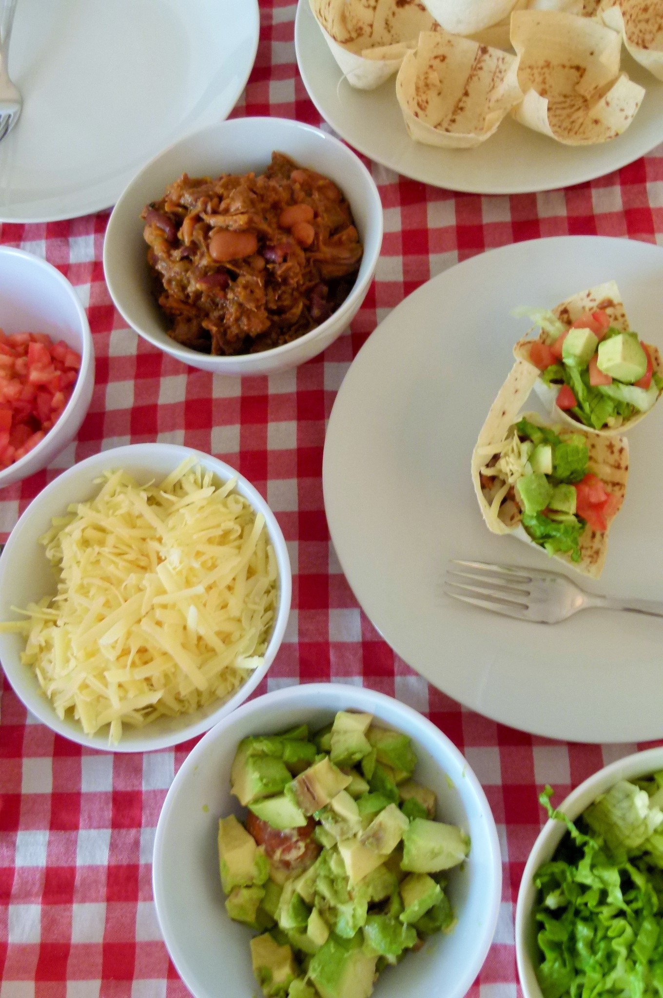 To serve, place all salad ingredients in small bowls in the middle of the table and let everyone make their own taco cups.
