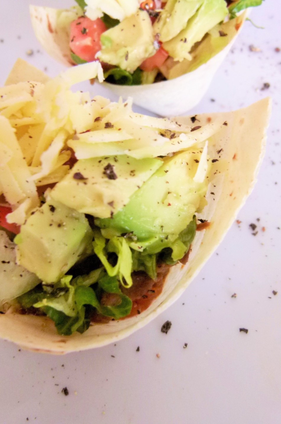 I like to place the meat/bean filling in first, topped with some cheese, Tabasco sauce, lettuce tomato and avocado. They’re messy but deeeee-lish-us!