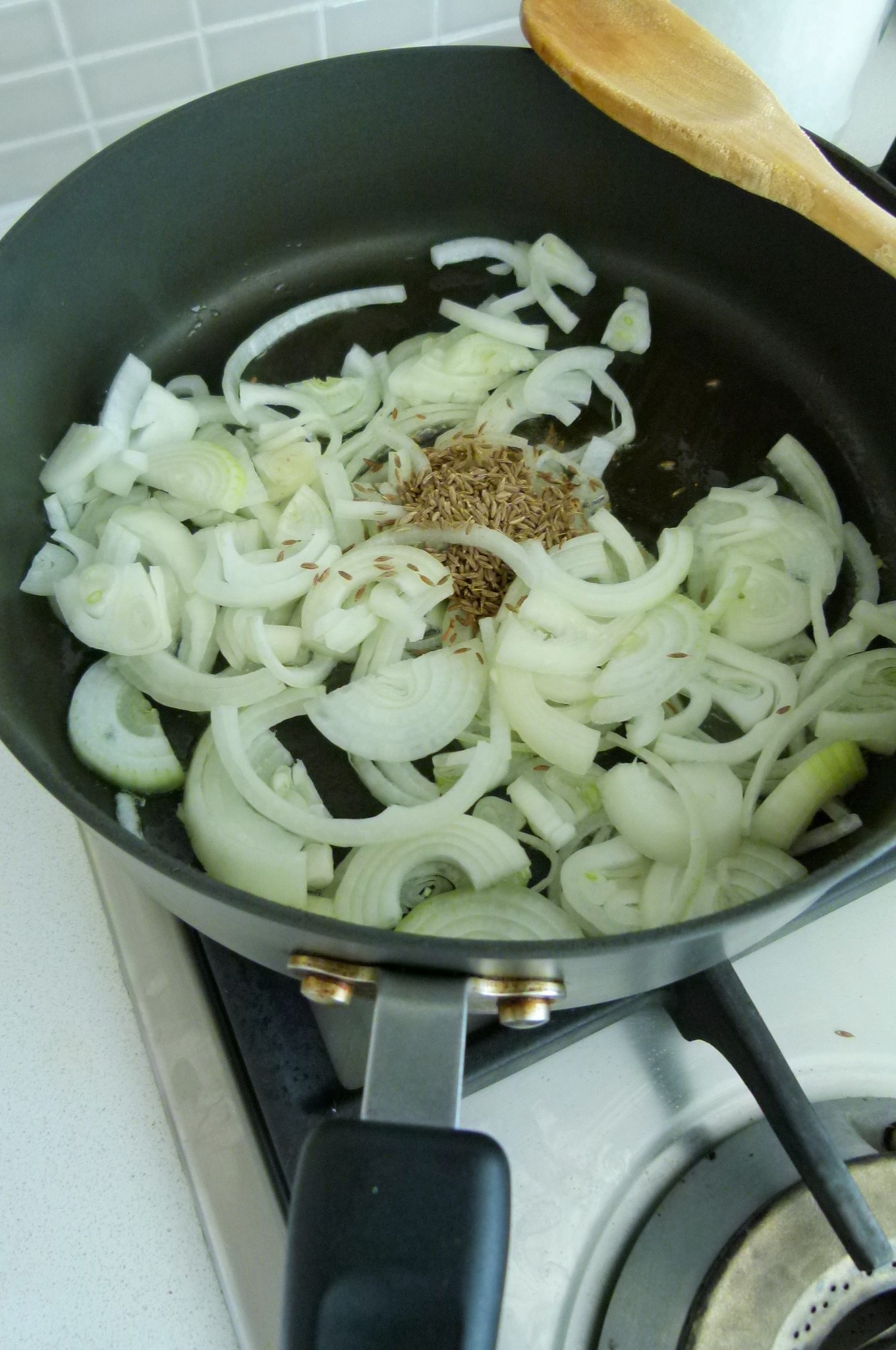 Heat oil in a frypan and cook the onion and cumin seeds for 3-4 minutes, until softened, on medium-high heat.