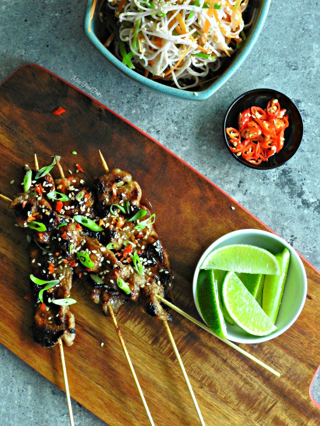 Sprinkle spring onions, chilli and sesame seeds over the pork skewers. Squeeze lime juice all over and enjoy!